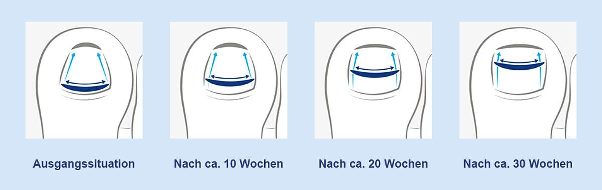 Das Onyfix Nagelkorrektursystem sorgt dafür, dass diese Form während des natürlichen Nagelwachstums beibehalten wird. Nach erfolgreicher Behandlung wird der Fußprofi die Modellierspange schmerzfrei vom Nagel entfernen.